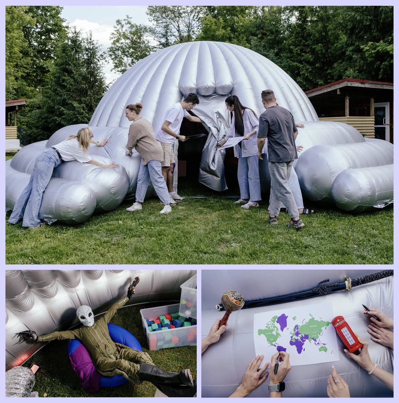 Продолжил бы кастомный тимбилдинг для своей команды заданием с глубоким погружением за счёт крутого реквизита: огромный макет НЛО и инопланетянин, прилетевший в нём. Тут нужно тихо пробраться внутрь тарелки, обыскать её и собрать предметы, характерные для разных стран, не разбудив спящего инопланетного пилота. Вот тут уже настоящее приключение без права на ошибку. Но после квадробола моя команда уже готова ко всему.