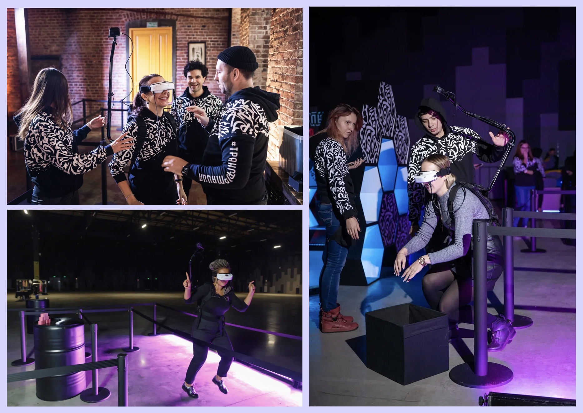 Куда в современном мире без диджитальности? Будет она и у нас. Это задание как раз из того тимбилдинга, после которого меня осенило повторно придумать кастомные игровые решения. Тут каждый почувствует себя героем компьютерной игры, когда увидит себя со спины, от третьего лица! Для этого на каждого участника надевают специальное оборудование с VR-очками и камерой GoPro. А потом отправляют на поиски в лабиринт, где необходимо добыть кусок общего пазла. И крутись как хочешь. Шучу. Команда всегда рядом и подскажет, как и куда идти, если вдруг запутаешься от непривычного вида на себя любимого. Только нужно убедиться, что на площадке есть затемнённая локация, без которой задание теряет атмосферу загадочности.