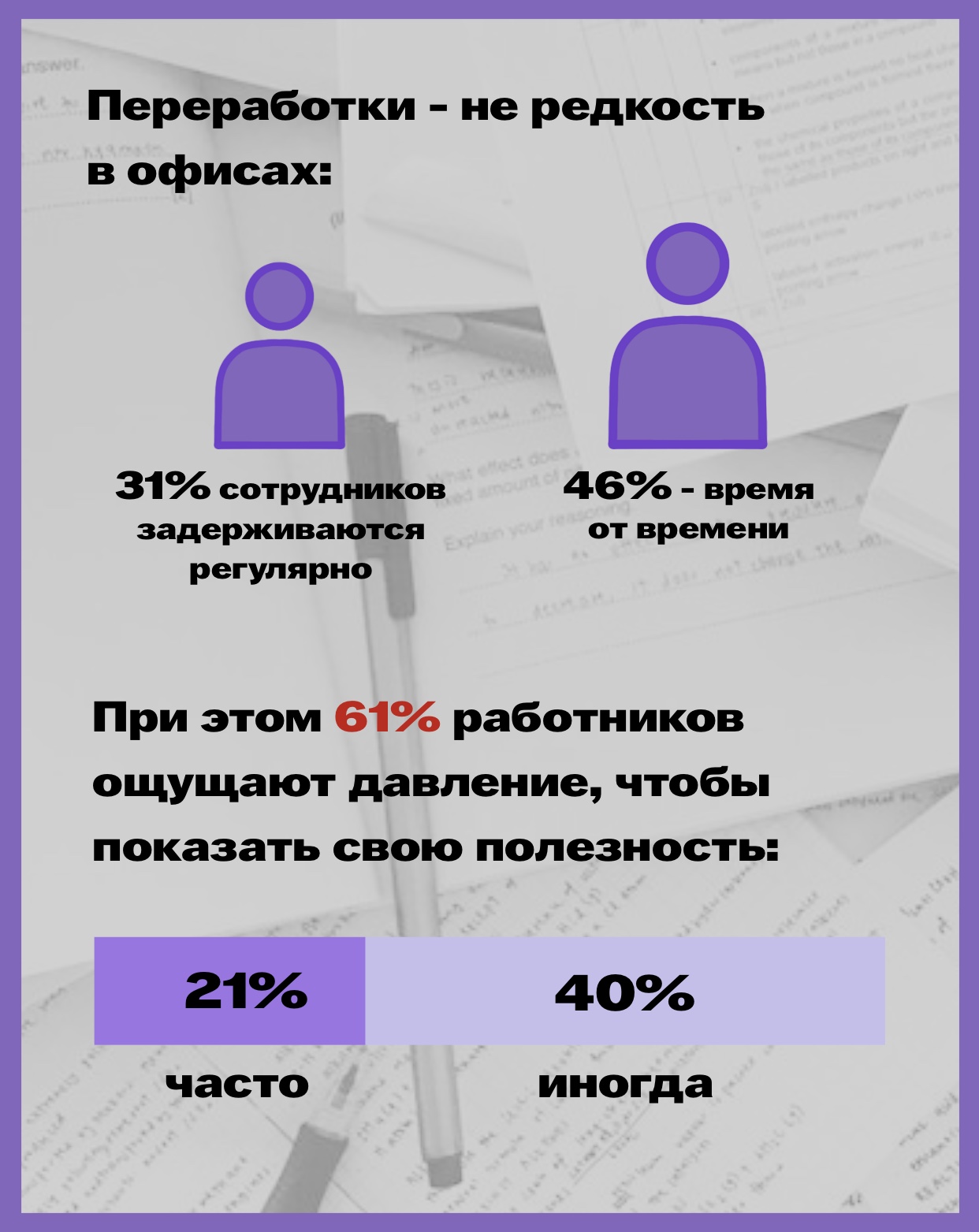 Среди тех, кто постоянно перерабатывает, 31% считают, что без этого их сочтут «ненужными» и лишат премий или повышения зарплаты.