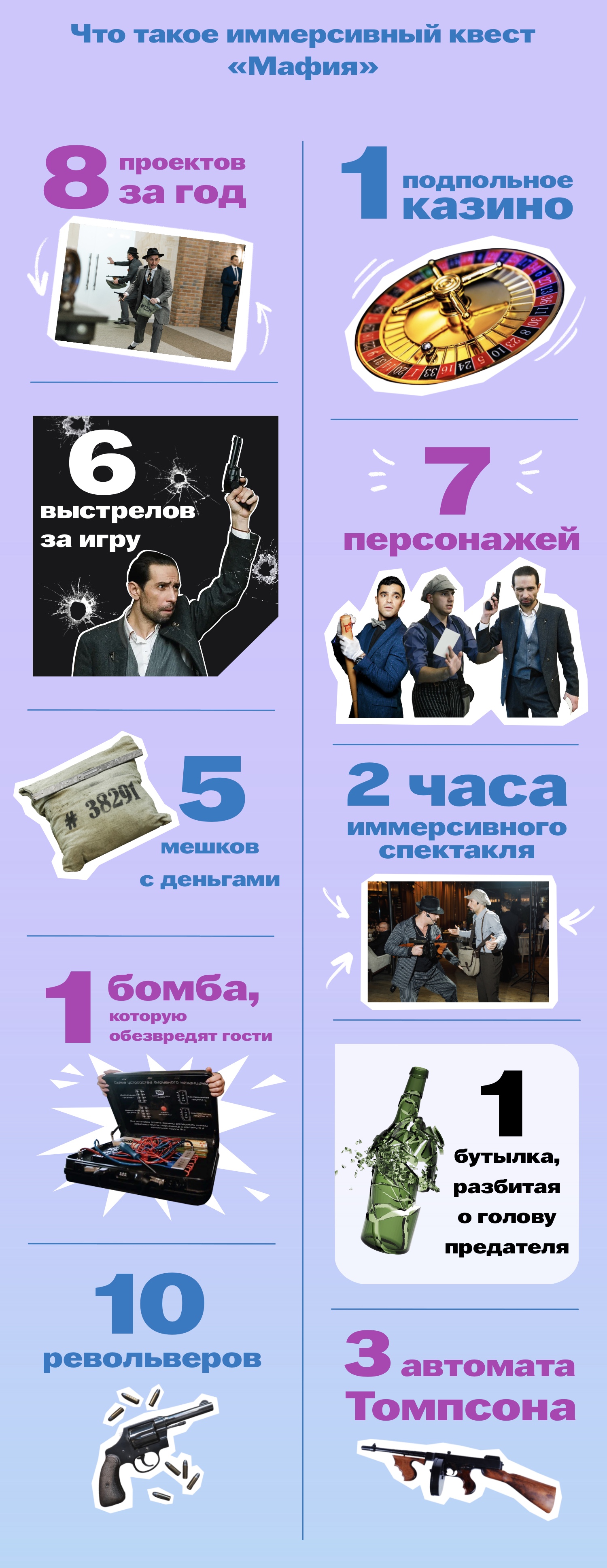Иммерсивное шоу «Мафия» от NIGHT STREET — это не настольная игра, а полноценный криминальный спектакль, в котором участники попадают в атмосферу гангстерской эпохи. В ход идут револьверы, мешки с деньгами, стрельба холостыми и спецоперация по обезвреживанию бомбы. Мы собрали в инфографике всё, что делает этот формат таким зрелищным и азартным.