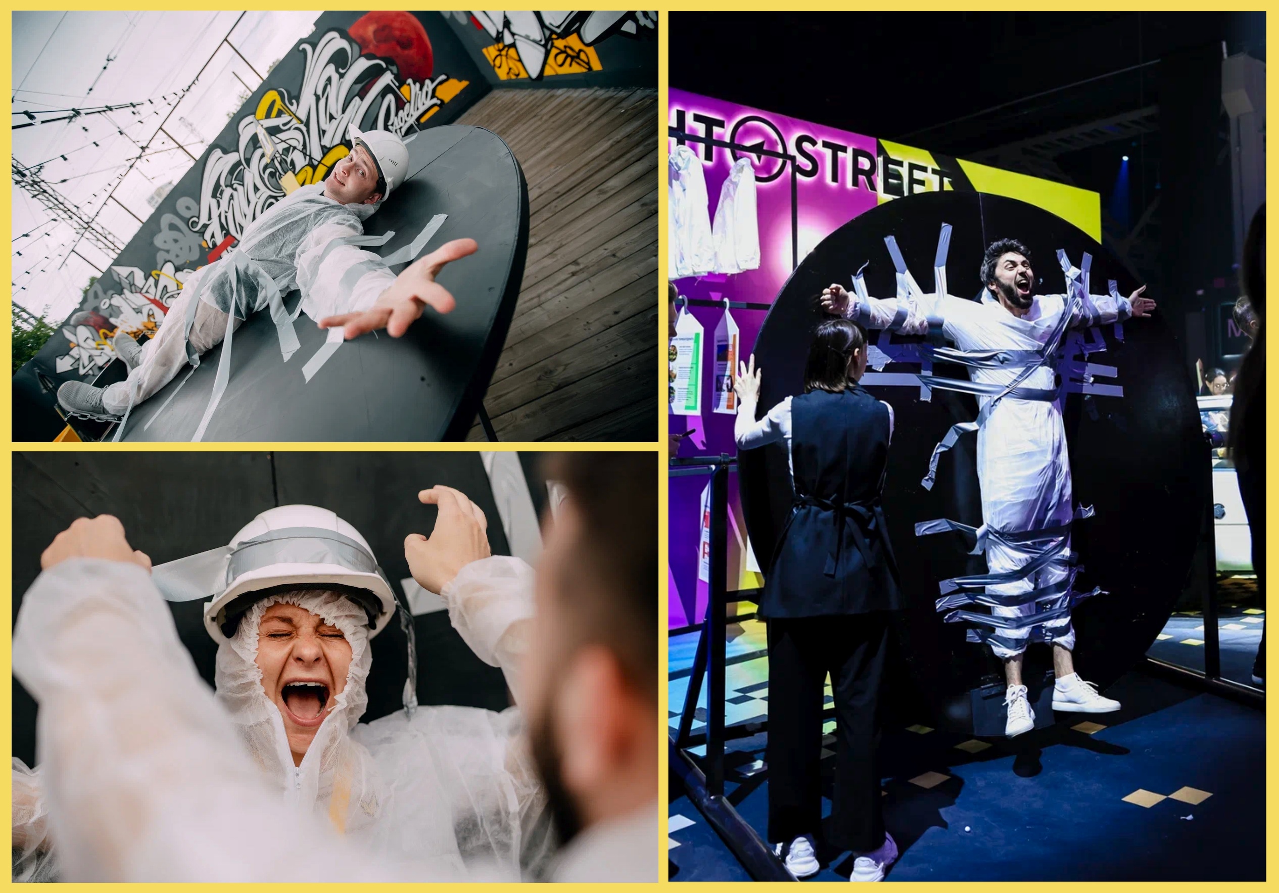 Например, приклеить одного из коллег скотчем к специальной конструкции. Причём так крепко, чтобы тот не упал, да ещё и получил удовольствие (да-да, это было).
